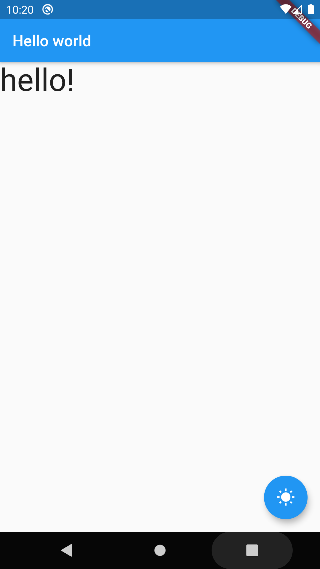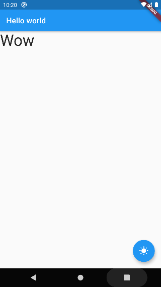 import 'package:flutter/material.dart'; //์ฑ ์์ ๋ถ๋ถ void main() { runApp(MyApp()); } class MyApp extends StatelessWidget { // This widget is the root of your application. @override Widget build(BuildContext context) { return MaterialApp( title: 'Flutter Demo', theme: ThemeData( primarySwatch: Colors.blue, visualDensity: VisualDensity.adaptivePlatformDensity, ), home: MyHomePage(), ); } } class MyHomePage extends StatefulWidget { @override _MyHomePageState createState() => _MyHomePageState(); } class _MyHomePageState extends State<MyHomePage> { var _text = "Wow"; @override Widget build(BuildContext context) { return Scaffold( appBar: AppBar( title: Text('Hello world'), ), body: Text( _text, style: TextStyle(fontSize: 40), ), floatingActionButton: FloatingActionButton( onPressed: (){ setState(() { _text = "hello!"; }); }, child: Icon(Icons.wb_sunny), ), ); } }