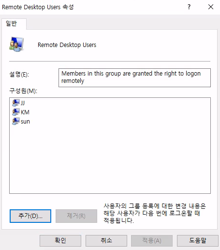 ์ ์ ๋ฅผ ๊ด๋ฆฌ์ ๊ณ์ ์ผ๋ก ๋ฐ๊ฟ์ฃผ๊ฑฐ๋, ๊ด๋ฆฌ์ ๊ถํ์ ์ฃผ๊ธฐ ์ซ๋ค๋ฉด ์๋ ๋ฐฉ๋ฒ์ ํตํด Remote Desktop Users ๊ทธ๋ฃน์ ์ถ๊ฐํ๋ฉด ๋๋ค.