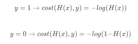 ์๊ทธ๋ชจ์ด๋ ํจ์์ ํน์ง์ ํจ์์ ์ถ๋ ฅ๊ฐ์ด 0๊ณผ 1์ฌ์ด์ ๊ฐ์ด๋ผ๋ ์ ์ด๋ค. ์ฆ, ์ค์ ๊ฐ์ด 1์ผ ๋ ์์ธก๊ฐ์ด 0์ ๊ฐ๊น์์ง๋ฉด ์ค์ฐจ๊ฐ ์ปค์ ธ์ผ ํ๋ฉฐ, ์ค์ ๊ฐ์ด 0์ผ ๋, ์์ธก๊ฐ์ด 1์ ๊ฐ๊น์์ง๋ฉด ์ค์ฐจ๊ฐ ์ปค์ ธ์ผ ํ๋ค. ์ด๋ฅผ ์ถฉ์กฑํ๋ ํจ์๊ฐ ๋ฐ๋ก ๋ก๊ทธ ํจ์๋ค! ๋๊ฐ์ ๋ก๊ทธํจ์๋ฅผ 0.5๋ฅผ ๋์นญ์ผ๋ก ๊ฒน์น๋ค๋ฉด, ์ ์กฐ๊ฑด์ ์ถฉ์กฑํ๋ cost function์ ๋ง๋ค ์ ์๋ค. ๋ค์์ y=0.5์ ๋์นญํ๋ ๋ ๊ฐ์ ๋ก๊ทธ ํจ์ ๊ทธ๋ํ์ด๋ค.